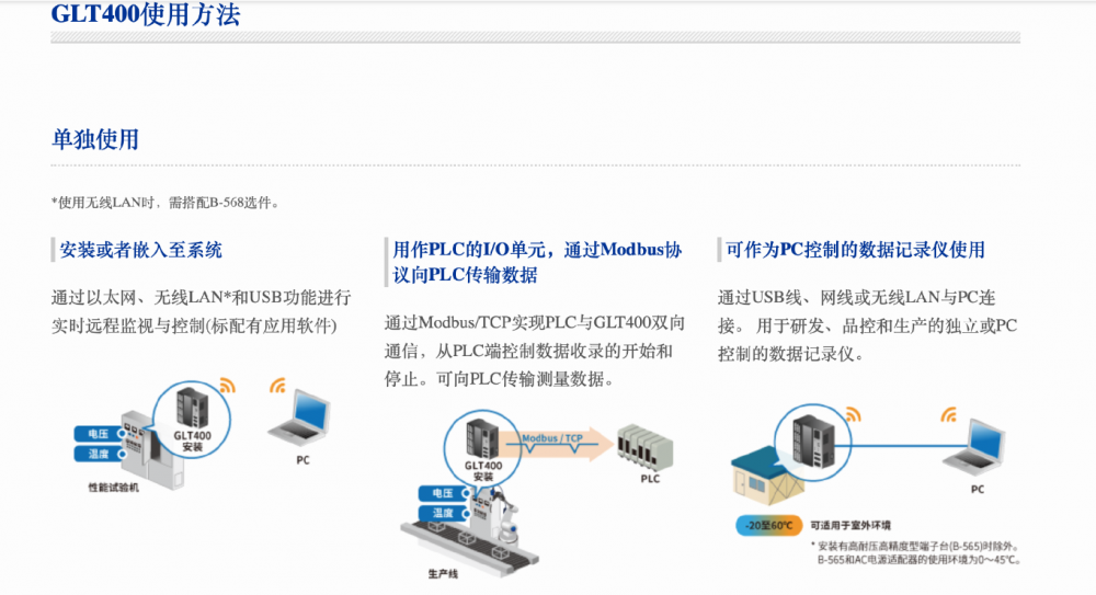 GLT400,PLC搭档无线RTU,多路RTU,可以扩展到200通道,可以记录电压、电流、温度、湿度等数据,新增了快插模块,使接线更简单。还可以通过Modbus和TCP协议把采集好的数据上传到PLC上通讯实时记录数据。支持WEB服务器、FTP服务器和FTP客户端网络功能用于远程监控。GLT400还有多种供电方式。交流电供电,车载电源供电,电池供电。